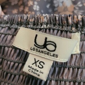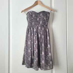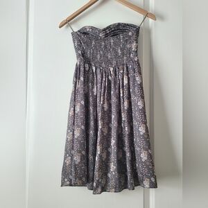 Strapless floral minidress with quilted bodice detail and smoked elastic back. Quilted design provides quality structure and lining to bodice. Skirt is fully lined. Soft grey with neutral floral print.