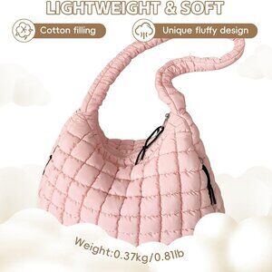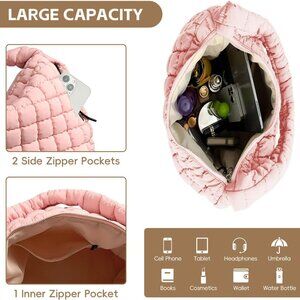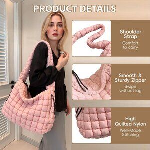 Features: Soft, padded with cotton for a comfy feel. Made of durable, tear-resistant nylon with a chic quilted puffer design that adds a trendy vibe. Spacious enough for your tablet, laptop, books, makeup, and more without feeling bulky. Comes with a padded shoulder strap that's wide, soft, and designed for comfort during long wear. Multiple zippered compartments—including two side pockets and a large main zip pocket—help keep everything organized and within reach.