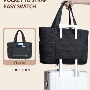 Features: Lightweight puffer tote with a spacious 20L capacity, making it great for work, travel, or gym sessions. The quilted design adds a trendy touch, and the multiple pockets help keep everything organized—your laptop, essentials, and more. The zipper closure keeps everything secure, and the convertible back strap makes it easy to attach to luggage for quick travel.