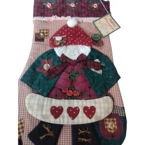 Quilted Treasures Folk Art Christmas Stocking Vtg Mrs Santa Baby Button Holiday