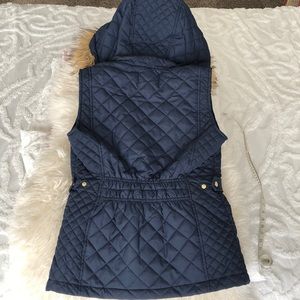 EUC navy quilted vest with gold hardware. Faux fur lined hood in removable. Size is S but will fit XS. Not very warm, more of a fashion statement vest and is lightweight.
