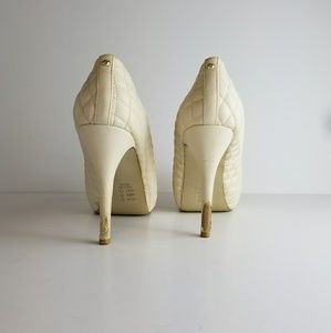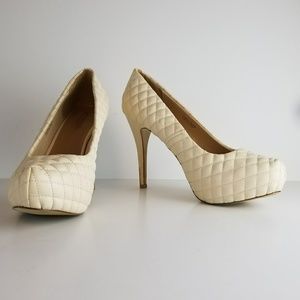 Used condition. Back of heel shows wear. Slight pink blush stain. See pic. Otherwise, front is in excellent condition. Listed brand for exposure.