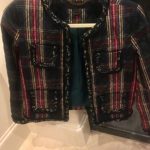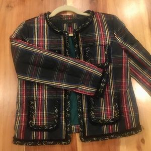 Cozy and elegant J Crew quilted plaid jacket that hits above the hips. Perfect color patterns for the holidays season. Lined with navy braids. Size 4. Patch pockets. Hook-and- closure. Fits true to size. Worn once. Like new.