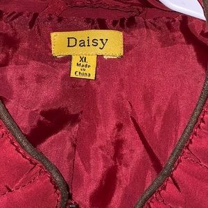 Burgundy/dark red with brown piping & gold zippers…adjustable in back to make snug fit