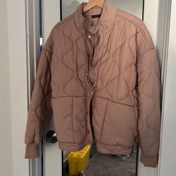 Light pink, so warm quilted jacket. Bought in Canada on a whim and don’t need it in California anymore.
