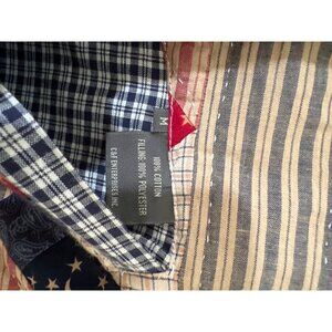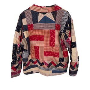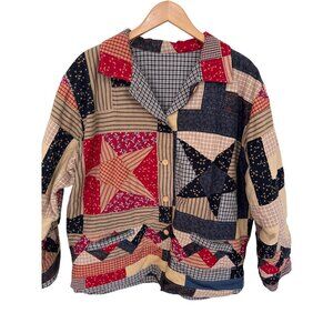 Fun and funky quilted jacket in size medium, but is oversized - please see measurements. Pit to pit measurement is 24 inches. Shoulder to hem is 28 inches. Fun Americana print of red blue and tan with a star motif. This is in excellent gently used condition with no holes or stains. 100% cotton