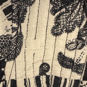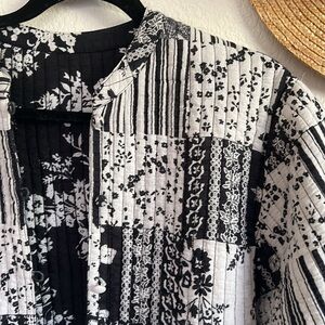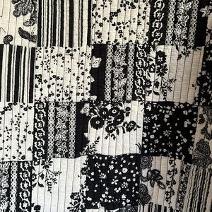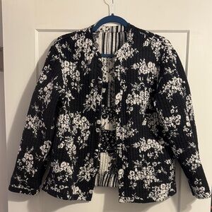 Lightweight black and white women's jacket featuring a patchwork floral design. Quilted, reversible, has pockets. GUC.
