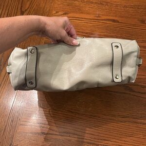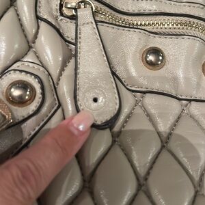 Elegant quilted tan handbag with gold accents. Perfect for any occasion. Preowned used condition. Has life left. Does have some wear on all bottom corners and missing gold accent on one pill. Please see pictures. I cannot read what brand it is.