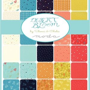 A colorful desert dream! This is a complete fat quarter bundle of 34 fabrics, from Sherri & Chelsiβs Desert Bloom fabric line by Moda Fabrics. It features a bright palette of blues, corals, and yellows with delicate flower designs. This collection was released in 2017 and is out of print. 8 and 1/2 yards total fabric. All fabrics have been stored in a dark, conditioned space. Please note the last picture is from the manufacturer so you can view all of the fabrics.