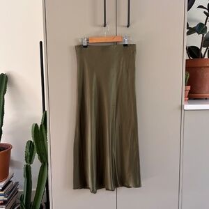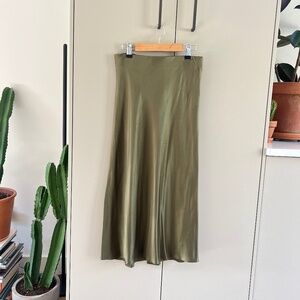 Worn Once || Modern, midi, mulberry. This skirt pairs perfectly with just about every top. It's super stylish with a bias cut and super comfy with a hidden elastic waist. Plus, silk fiber contains 18 kinds of amino acids that make it amazing for skin nourishment, hypo-allergenic, and naturally thermoregulating to help maintain body temperature.