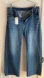 Nearly new. Worn and washed twice; sizing down as I lose weight and sticking with this product because they fit and look great in a modern way. Quince uses a nice heavyweight denim. Size is equivalent to a 16. I find the 32" length on the long side; the jeans brush the floor in an on-trend way. Sized through this so quickly I still have the tags.