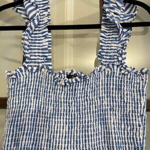 Excellent condition Quince Blue and White Striped Smocked Dress, Size Medium.