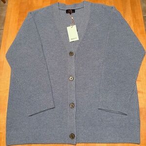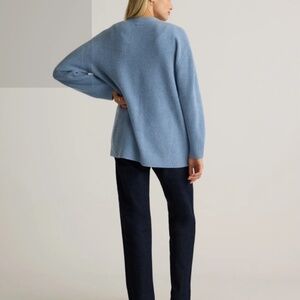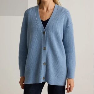 Quince 100% Mongolian Cashmere Oversized Boyfriend Cardigan Sweater Size M - "Faded Denim" color , which is a light dusty blue. Generous Oversized fit -- roomy in the shoulders, sleeves and chest. Size M (fits more like a L due to the oversized styling). Gorgeous color, super soft with a medium ribbed texture. This is a gorgeous, cozy weight, quality made sweater, brand new with tags. Priced at $139.90 on Quince's website. No low-ball offers, please.