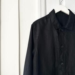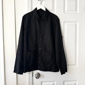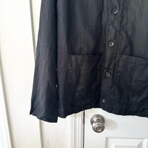Size large men from Quince. 100% linen black European boxy shirt jacket button front with collar and open front waist pockets. Preowned in good condition with no stains or tears.