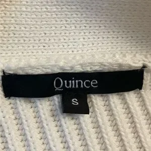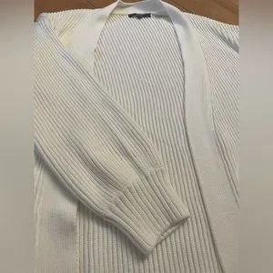 Soft ribbed knit cardigan by Quince. Open-front design with relaxed fit. Long balloon sleeves and patch pockets. Lightweight and cozy for layering.