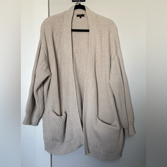 Elegant cream cardigan with ribbed texture. Open-front design. Perfect for layering.