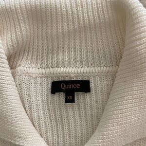 Soft ribbed knit sweater by Quince. Classic cream color. Cozy high collar. Simple, versatile style.