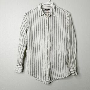 Quince long-sleeve button-up shirt in oatmeal with black stripes. Made from 100% European flax linen—breathable, lightweight, and naturally heat-regulating. Relaxed fit perfect for layering or wearing alone. New Without Tag.