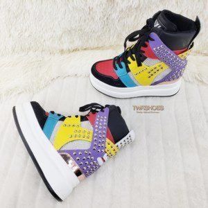 Quince Hidden Wedge Platform Punk Designer Sneakers Black Multi Rhinestones