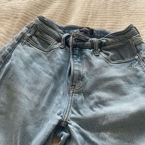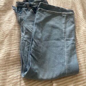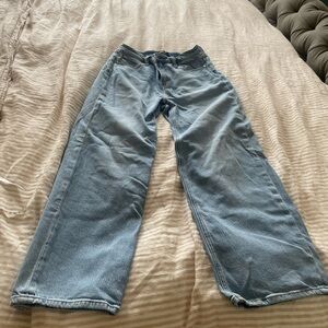 Stylish straight leg jeans. Light blue denim. Comfortable fit. Perfect for casual wear.