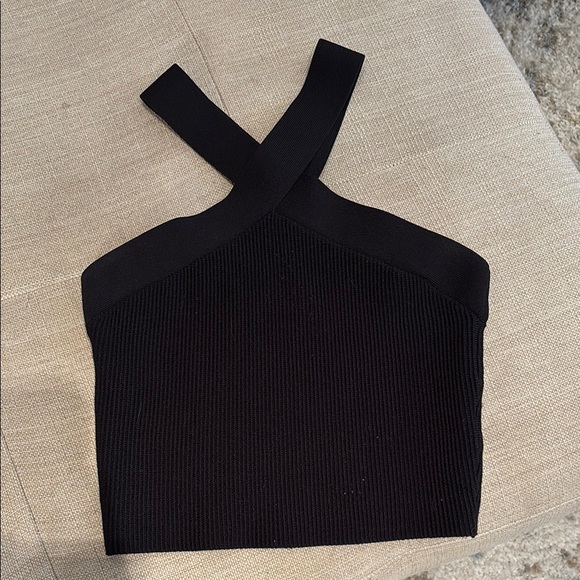 Stylish black ribbed top with cross-back straps. Stretchy material! Chest: 12” Length: 13”