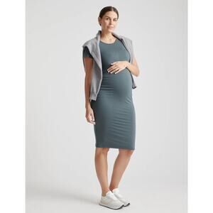 Quince Tencel Jersey Maternity Ruched Short Sleeve Dress Dark Olive Small-Excellent pre-loved Condition