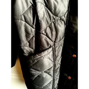 Stay warm and stylish in this classic Quince black quilted jacket, designed with a flattering longline cut and diamond-quilt pattern. It is a women’s size medium and is roomy. Features include: