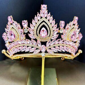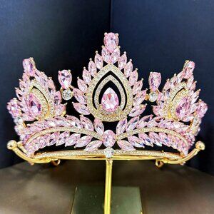 Quinceanera Crown, Pink Rhinestone Crown, Large Size Crown, Gold Crystal Crown