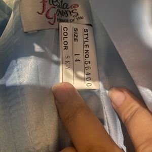 Beautiful gown for a quinces or sweet 16. Color sky blue and gold. Made fiesta gowns / house of Wu. No alterations made. It’s a corset tie back which can adjust in size. This size 14 can go down to a 12 I’d say. Only used twice for a short period of time, once for pictures and once for part of the party before she changed out. It’s in excellent conditions!
