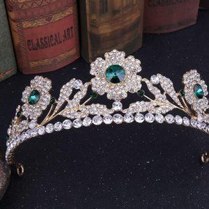 ***********Beautiful gold Tone clear silver and green Rhinestone Crystal vintage style Crown Tiara for Adults **************