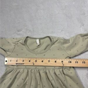 100% organic cotton. Green with black geometric design, long sleeves with lettuce trim cuffs, a line, fit and flare