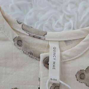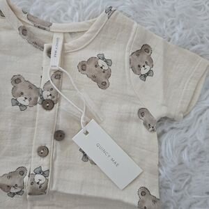 Quincy Mae Short Sleeve Woven Romper in Teddy. Size 0-3 months. New.A sweet an