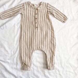 Quincy Mae Woven Long Sleeve Jumpsuit in Fern Stripe Size 0-3 Months. Crew neck with button henley neckline and snap closure at inseam. Material as shown in photos. 100% cotton. Unisex style.