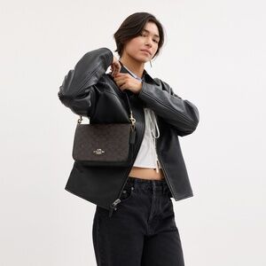 Signature coated canvas and smooth leather Inside multifunction pocket Snap closure fabric lining Detachable handle with 10 1/4 drop Outside open pocket Detachable strap with 21 1/4 drop for shoulder or crossbody wear 8 1/2 (L) x 6 1/4 (H) x 3 (W) Style No. CZ770