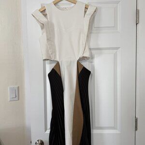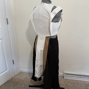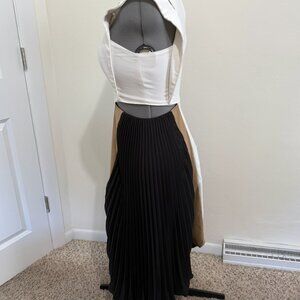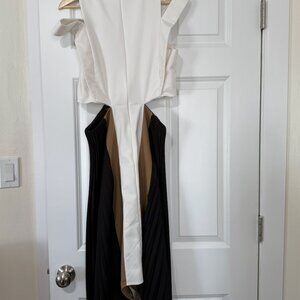 This white, tan, and black color black midi dress is cut in a high-low fashion and features cut-outs along the waist and shoulders. It's extremely flattering. The zipper goes down to the lower back and has pleats on the left and right sides below the hips.