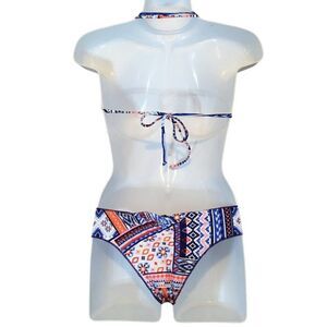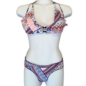 Quint Soul 2 piece bathing suit in blue, orange and navy geometric design.