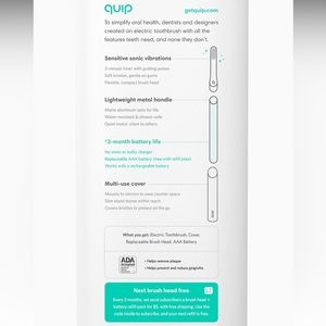 *Modern, sleek Electric Toothbrush, 100% recyclable paper packaging *Sensitive sonic vibrations, 2-minute timer, 30-second pulses *3-month charge on a AAA battery (no wires or charger) *Replaceable soft-bristle brush head with tongue scraper & travel cover *Helps remove plaque, prevent & reduce gingivitis *American Dental Association-Accepted *Lifetime warranty & first refill free with subscription at getquip.com *Best with quip Mint Toothpaste, Floss String, Floss Pick, & MouthwashSlim, lightweight metal handle, water-resistant, shower-safe