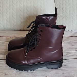 Quipid burgundy platform vegan leather combat boots with lug soles