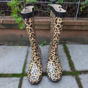 Cute and quirky capellis leopard print rain boots with wedge heel. Size 6