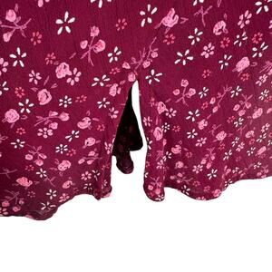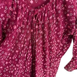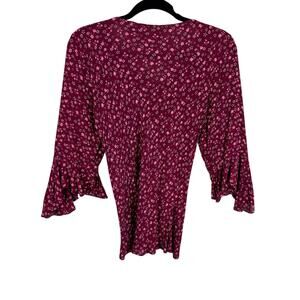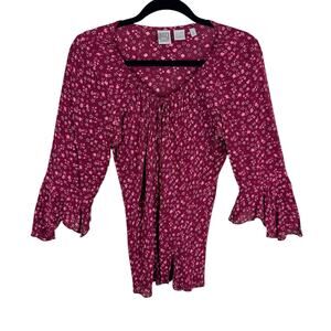 Excellent preowned condition. Pink floral lightweight V-Neck 3/4 ruffled asymmetrical sleeve pullover blouse. 100% viscose material. Approx. measurements: Shoulder to hem 28", pit to pit 23", sleeve from neck to sleeve hem 24". Size L.