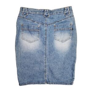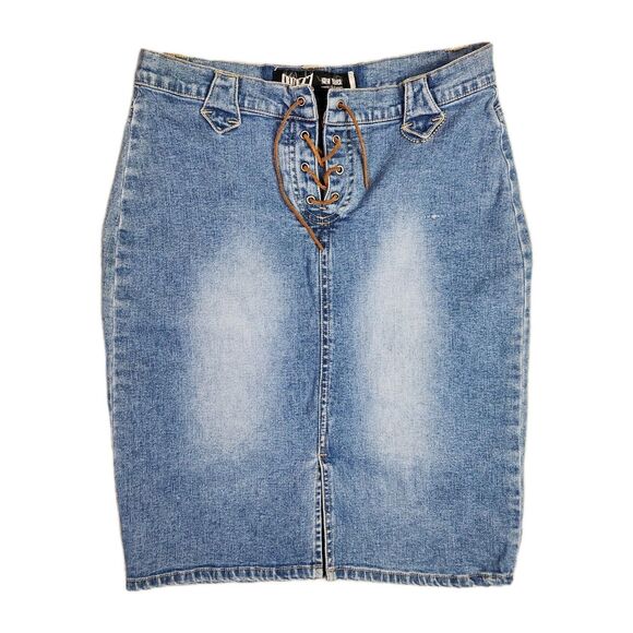 Quizz New York Blue Denim Skirt Women's Size 5/6 Midi Y2k Style Lace Front Low Rise Bratz 1990s Retro Prairie Farm Cottagecore Lagenlook Outdoors Summer Modest Minimalist Basic Casual Stretch Everyday Workwear Style.