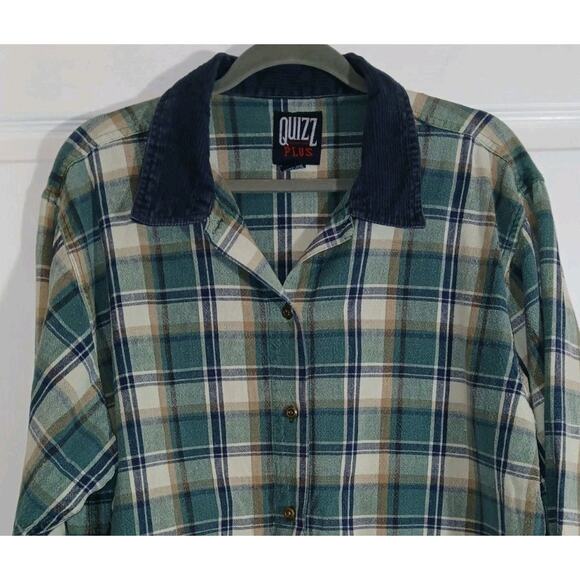 This Vintage Quizz New York shirt is a classic piece with a blue-green plaid design, featuring a corduroy collar and long sleeves with button closures. Made from 100% cotton in a plus size 20, this button-up top is perfect for casual occasions in any season. The retro 90s style and vintage charm make it a standout addition to any woman's wardrobe. Machine washable for easy care, this top is a versatile and timeless choice for those looking for a combination of comfort and style.
