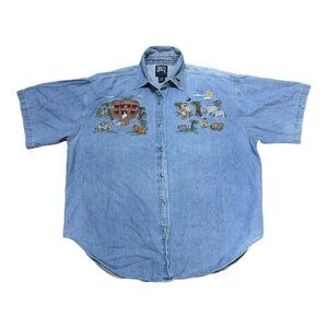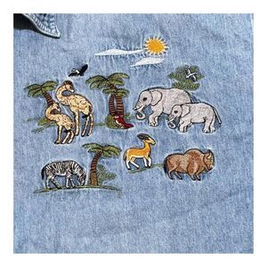 Look at this shirt! It's got more animals than a zoo, all embroidered on a cool denim backdrop. Wear it and feel like the king of the jungle!