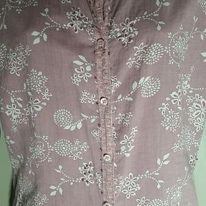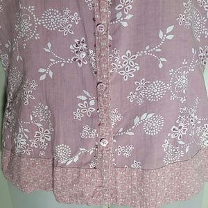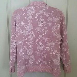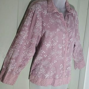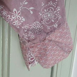 Lavender hue with boho floral print in white, collar, cuffs and hem have another pattern, petite buttons up to a v-neck, darted seams on front, 22" from underarm to underarm, 21.5" from top shoulder seam to hem, sleeves 3/4
