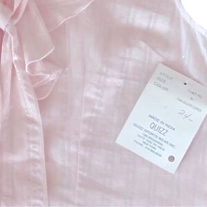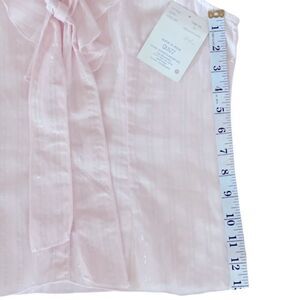 Pink with silver lurex stripes makes this semi/sheer ruffled button front blouse so feminine. Feature a tie at V-neckline and darts in front and back.