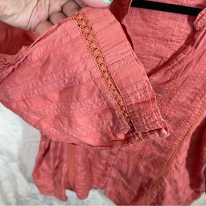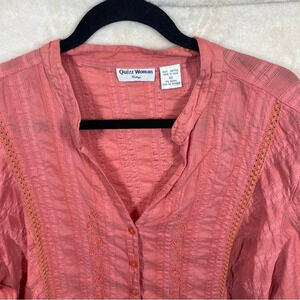 Quizz woman casual button down shirt coral pink beaded floral coastal cotton 22