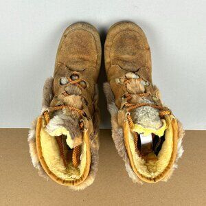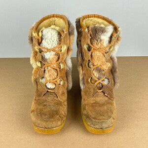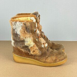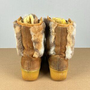 Quoddy Vintage Moccasin Boot Womens 7 Tan Brown White Lace Up Suede Faux Fur