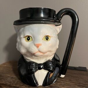 Unique vintage 1980 ceramic cat mug in black, white and gray dressed in formal attire. Its cane is the handle.