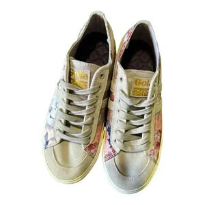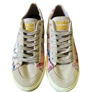 Stride in style and comfort with the Gola Quota II Liberty PJ Lavender Floral Print Leather Sneakers! Perfectly soft genuine leather and fabric forms these sweet lace-up sneakers with an adorable floral print in hues of pink, navy blue, purple, and taupe. A 1.25" white bumper sole is accented by a centered, dusty purple, stripe. Logo tag at the heel. Available in whole sizes.