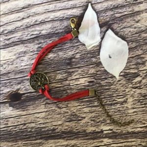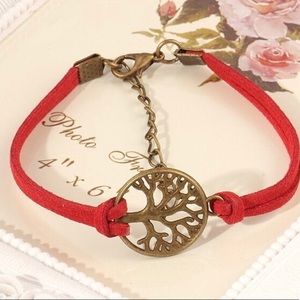 Red rope tree of life bracelet. Red leather band. Brushed antique gold colored hardware.